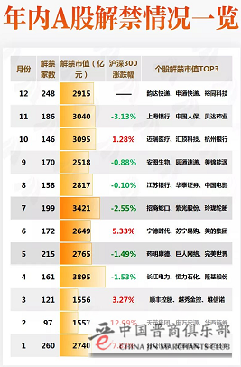 全年来看,今年4月、7月、10月、11月的当月解禁市值均超过3000亿元,除10月之外,其余3个月的当月沪深300指数均为下跌。而2月和3月的解禁市值则仅为1557亿元和1556亿元,这两个月内沪深300指数也有较大涨幅,分别上涨了12.99%和3.27%。