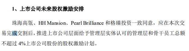 珠海高瓴等同意,应在本次交易完成交割后,推进上市公司层面给予管理层实体认可的管理层和骨干员工总额不超过4%上市公司股份的股权激励计划。