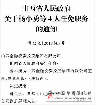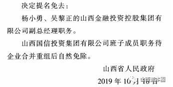 山西资本圈注意到,就在此前的2019年11月,也即成立四周年“收官”前夕,山西金控集团召开干部大会,宣布集团领导层最新调整。据了解,杨小勇仍任集团专职党委副书记的同时,由副总经理升任副董事长,并给予正职待遇;韩良会、曹煜则双双出任集团副总经理,吴黎正则卸任原集团副总经理一职。
