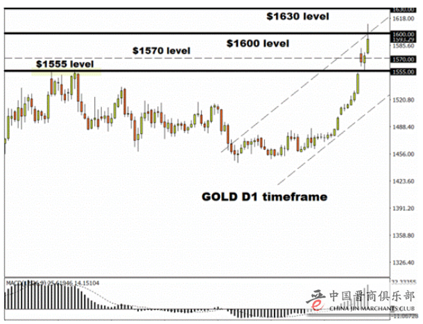 坚定收于1600美元以上可能会推动黄金向1630美元运动。相反,金价在1600美元下方持续疲弱可能引发价格跌向1570和1555美元。