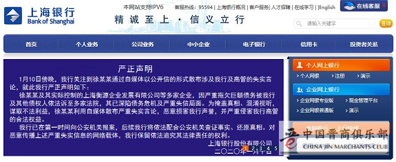 1月11日,上海银行发表示声明称,徐某某及其实际控制的上海衡源企业发展有限公司等多家企业,因严重拖欠巨额债务被我行及其他债权人依法诉至多家法院,其已深陷债务危机及严重失信局面。为掩盖真相、混淆视听,谋取不法利益,徐某某利用自媒体散布严重失实言论,恶意损害我行声誉,并严重侵害我行高管的合法权益。