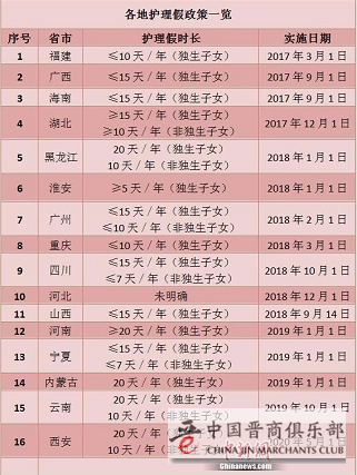 据不完全统计,截至目前,已至少有福建、广西、海南、湖北、黑龙江、淮安、广州、重庆、四川、河北、山西、河南、宁夏、内蒙古、云南、西安在内的16地出台了“独生子女护理假”相关的具体规定。