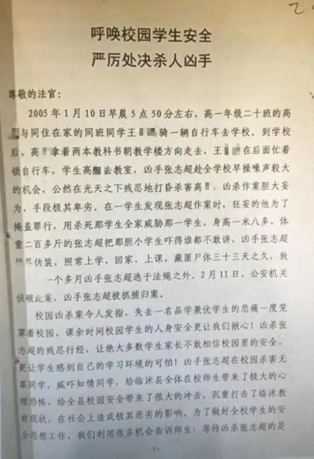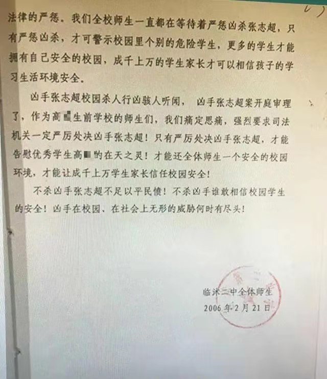 据悉在张志超案卷宗中出现盖有临沭二中公章的全体师生《呼吁校园安全,严厉处决杀人凶手》呼吁书,提出坚决处决张志超,不杀不足以平民愤等要求。全文内容如下: