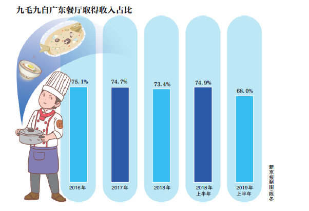 2016年,九毛九便开始寻求A股上市,但一直未能登陆资本市场,在2018年撤回A股上市申请并开始筹备香港上市。2016年-2018年,九毛九实现期内溢利分别为5128.6万元、7164.7万元和7384.8万元。其区域性较为明显,2016年、2017年、2018年、2018年上半年及2019年上半年,广东餐厅贡献收入占九毛九比例分别为75.1%、74.7%、73.4%、74.9%及68.0%。