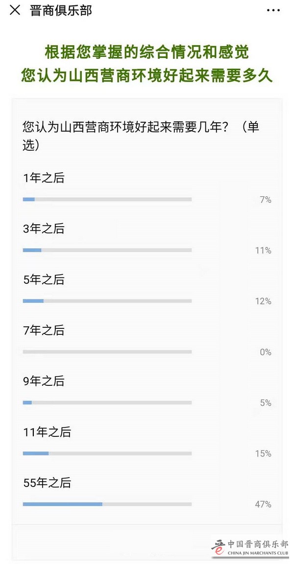 山西省的营商环境优化需要多少年,微信公众号“晋商俱乐部”上的网络投票调查还在进行中【点击这里参加投票】,目前的投票调查结果如下图:
