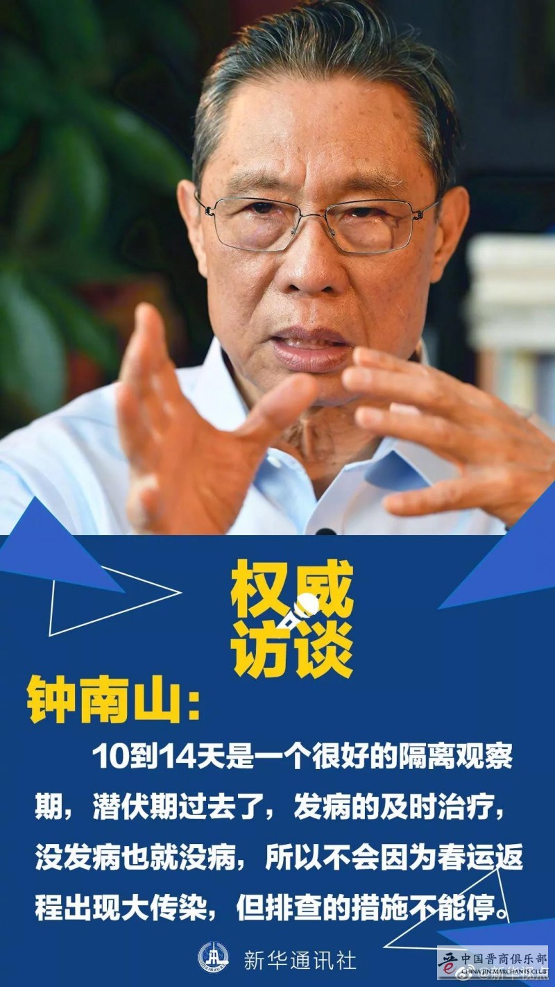 钟南山:10到14天是一个很好的隔离观察期,潜伏期过去了,发病的及时治疗,没发病也就没病,不会因为春运返程出现大传染,但排查的措施不能停。