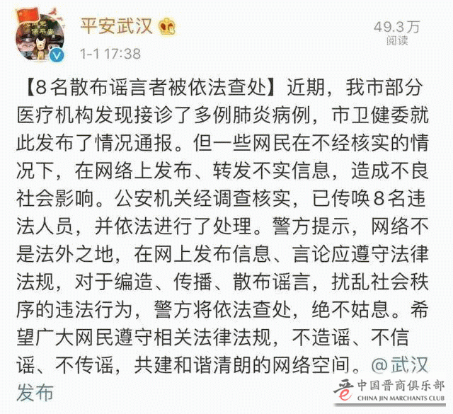 疫情早期,武汉市关于8名散布谣言者的处理声明2、虚假信息起源于信息公开的不及时、不透明。 谣言止于公开。群众基于对自身安全的焦虑,在面对突发公共卫生事件时,存在一定程度的慌乱,是人之常情,应予理解。如果在这种时刻,有关信息及时、全面地公开,群众的疑虑自然会削减;如果信息公开不及时、不透明,群众基于其社会交往圈与自己的生活经验,往往容易听信并传播各种谣言。解决谣言问题,依法处理是治标,信息公开是治本。我们做好了信息公开工作,群众就会将公开的信息和自己获知的谣言相对比,久而久之,当群众发现政府公开的信息永远正确时,谣言就自然失去了群众基础。反之,如果谣言一次次被现实证实,那么群众在突发事件面前,会自然地选择相信谣言。从这个意义上讲,各级官员决不能仅把信息公开认为是自己的“一亩三分地”,而是要站在党和国家工作全局的视角考虑问题。经此一役,我们要从中吸取深刻教训。遇到突发公共卫生事件,我们要坚定地相信群众的大多数。我们宁可把问题想得更严重一些,宁可把对群众的警示讲得更严肃一些,宁可把局势形容得相对严峻一些,以此激发起群众对公共卫生事件的高度重视,并紧紧依靠人民群众,打赢类似特殊战争。3、虚假信息起源于特殊的自媒体环境。我们今天面对的媒体环境与“非典”时期有根本差异。“非典”时期,尚不存在自媒体的概念,信息渠道只有官方媒体一种。彼时,论坛、博客、手机短信等非传统传播方式虽然存在,但造成的影响极其有限,尚不足以作为信息传递的主要通道。如今,情况发生了显著变化。随着商业媒体的发展以及微博、微信等一系列社交媒体的出现,人们的信息来源异常多元,个体的声音可以经由互联网而无限放大。身处在疫区的个体,可以通过语音、短视频等方式与社会公众进行更加直观、更加真切的交流,打破了官方媒体对信息传播的主导权。在海量的信息中,任何试图掩盖真相的尝试都只是徒劳,传统的信息管控措施也很难再有效实施。 这是我们第一次在自媒体环境中遭遇如此重大的公共卫生事件,而这种复杂局面,也是当今国家治理进程中,我们必须面对的时代课题。