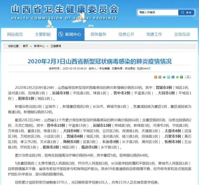 新增治愈出院1例(运城市),新增重症病例2例(长治市、晋城市各1例),危重减轻转为重症1例,重症减轻转为普通1例。新增疑似病例32例。