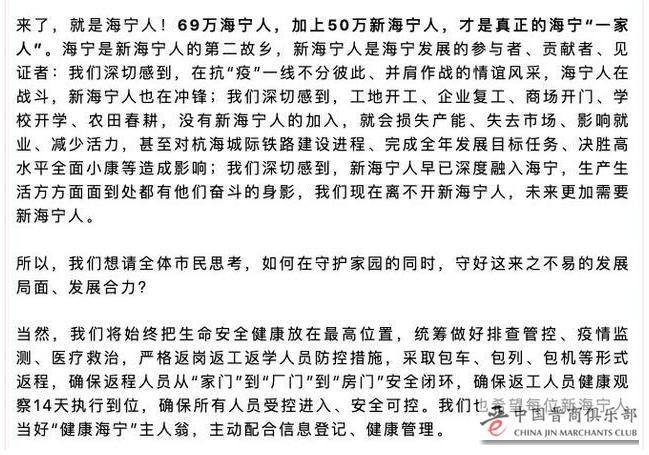 他提到,“如果每一个人,都把我们排除在外,那什么叫中国人的众志成城呢?我们现在市委市政府,我跟市长两人,对我们来自湖北、来自其他重点地区的职工和新海宁人,都告诫他们迟点回海宁。”