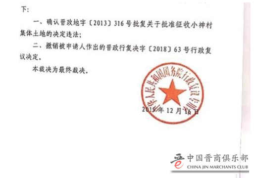 春节前,徐明轩终于拿到了国务院的裁决,国务院调查后认为,现有证据仅能证明征前告知了听证权利,但征地告知书及送达回证、村民代表会议纪要均未留存,仅凭证人证言,难以证明履行了征前告知程序;对拟征土地现状的调查结果未经被征地农村集体经济组织和农户确认,不符合有关规定。国务院裁决确认山西省政府关于批准征收小神村集体土地的决定违法,撤销了此前行政复议决定。