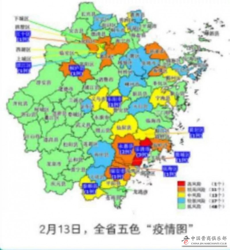 1、“一图”,即疫情图,浙江根据各县疫情风险状况,用五种颜色进行等级区分,只有低风险的县,才鼓励推进复工复产。