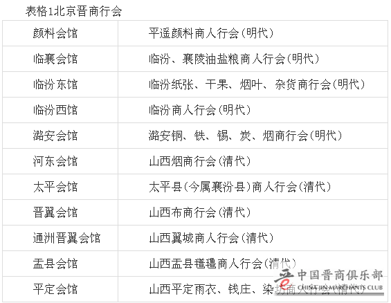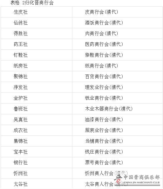 晋商行会组织名称似乎始终没有统一的规范,各依自己的信仰及偏好而命名。有的叫社,有的为会馆,后来有的改称公所或公会,有的改用商会。下面摘录北京、归化两城市的部分晋商行会情况: