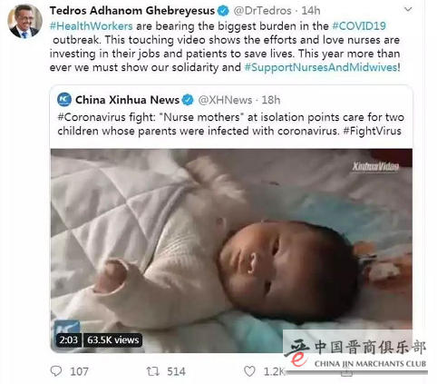 世界卫生组织总干事谭德塞通过社交媒体转发了一条新华社视频故事“护士妈妈”。谭德塞写道:医卫工作者在抗击新冠肺炎疫情中承受着最大的压力,这段感人的视频展现护士拯救生命的爱与力。我们比以往更需要团结一致。