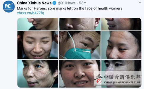 ↑长时间戴口罩工作,他们留下了“英雄的痕迹”