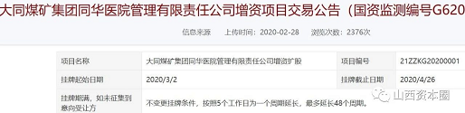 近日,山西省产权交易市场对外披露同煤旗下同华医院管理公司增资项目交易公告称,拟通过实施增资扩股引进1名外部投资方,后者将拥有51%的股权,此举意味着同煤集团将让渡旗下医疗集团控股权。