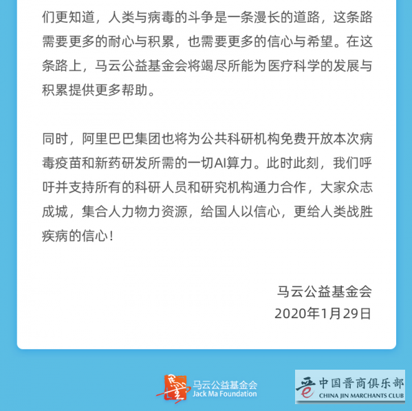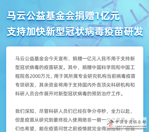 马云公益基金会宣布捐赠1亿元支持新冠肺炎疫苗研发公告图