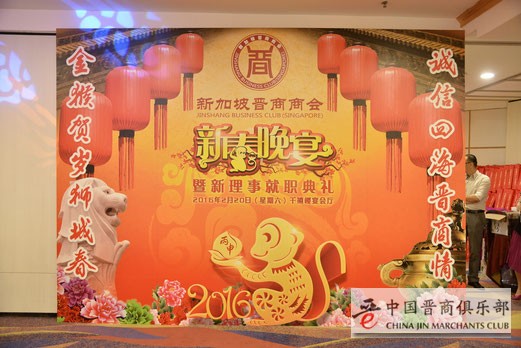 2016年2月20日(农历正月十三),新加坡晋商商会2016新春晚宴暨新理事就职典礼成功举行在新加坡巴耶利巴千禧楼隆重召开,参加此次活动的有出席此次活动的有新加坡原政务部长曾士生、中国驻新加坡大使馆参赞兼总领事刘红梅、中国贸易促进委员会新加坡代表处副总代表刘晓东、新加坡中华总商会中国事务组主任杨蔚君、山西牛商会会长郝泽锋、新加坡厦门公会会长林熙来、新加坡天津会会长陈力萍、陕西同乡会会长赵炳利、日本山西商会特使左岩龙斗,联合早报副总裁周兆呈等嘉宾。