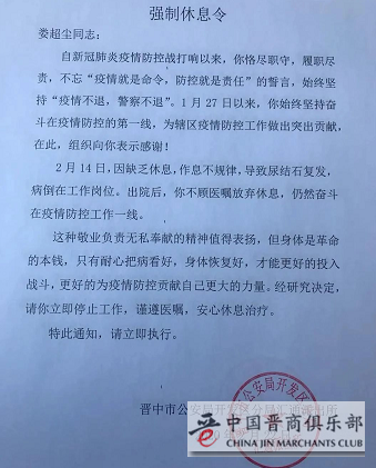 近日,晋中市公安局开发区分局汇通派出所发出一张强制休息令,要求所内民警娄超尘立即停止工作,回家休息。