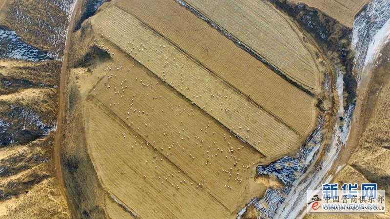 航拍陶小峰村一带,周边村庄的村民正在塬上放羊。“塬”因流水冲刷而形成,呈台状,四周陡峭,顶上平坦(2月11摄)