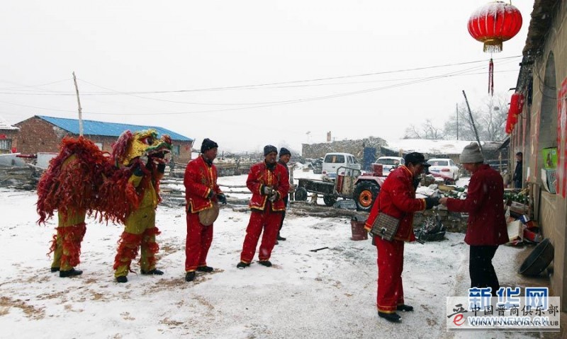 东水界村,每年春节,当地有组织秧歌队挨家挨户拜年的习俗。以前的春节秧歌队都以青壮年为主,队员大概20人。如今因年轻人不愿再参与,秧歌队越来越少,队员的平均年龄也逐渐走高。图为户主正按照习俗向前来拜年的秧歌队表示感谢(2月12日摄)