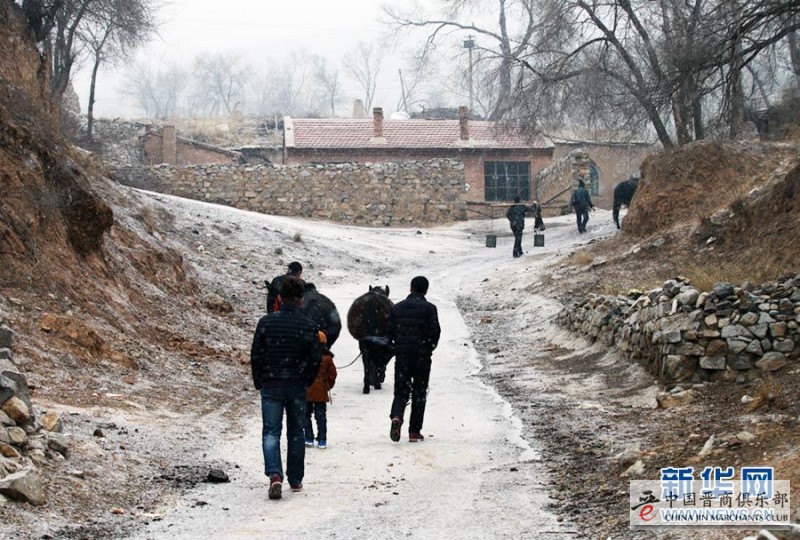 山西朔州市平鲁区北部东水界村,村子的几口水井都位于村前的沟里,每天早晨起来,村民拉着牲口到沟底饮水。图为春节假日回来的年轻人帮家里饮完牲口后往回走(2月12日摄)