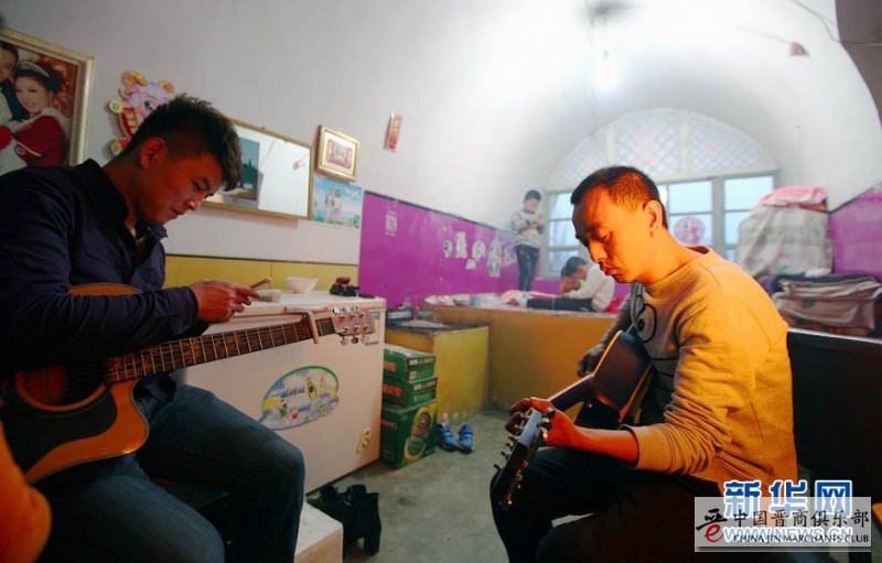 东水界村郝家老大与春节前来探亲的姨弟切磋琴技,他在呼和浩特开有一家广告公司,闲暇时候喜欢玩乐器(2月11日摄)