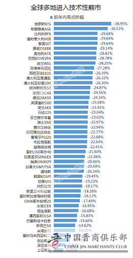 截至3月12日16点30分,从各国或地区股指的年内最高点算起,至少有29个国家或地区的股市进入技术性熊市,包括美国、德国、法国、英国、俄罗斯、希腊、意大利、巴西、西班牙、澳大利亚、日本、加拿大等。