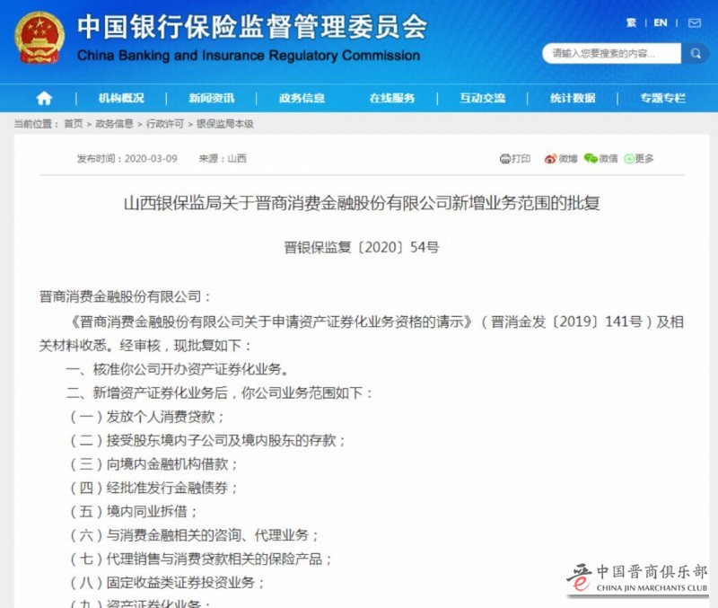 按照山西银保监批复显示,晋商消费金融业务包括发放个人消费贷款;接受股东境内子公司及股东的存款、经批准发行金融债券、境内同业拆借、资产证券化业务等共十项。