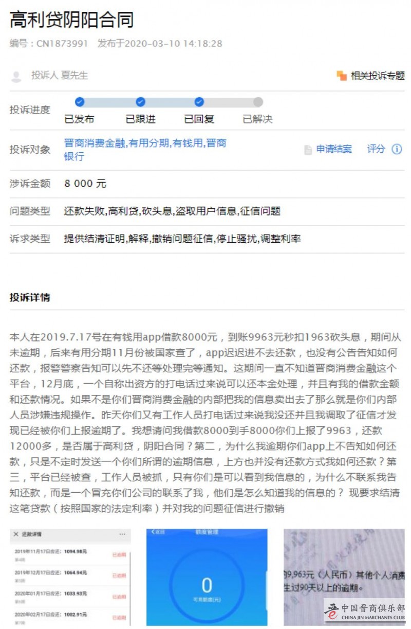 如小闪分期、百万钱包、如期分期等借款人在21CN聚投诉上投诉称,其存在砍头息、高利贷,而放款方就是晋商消费金融。