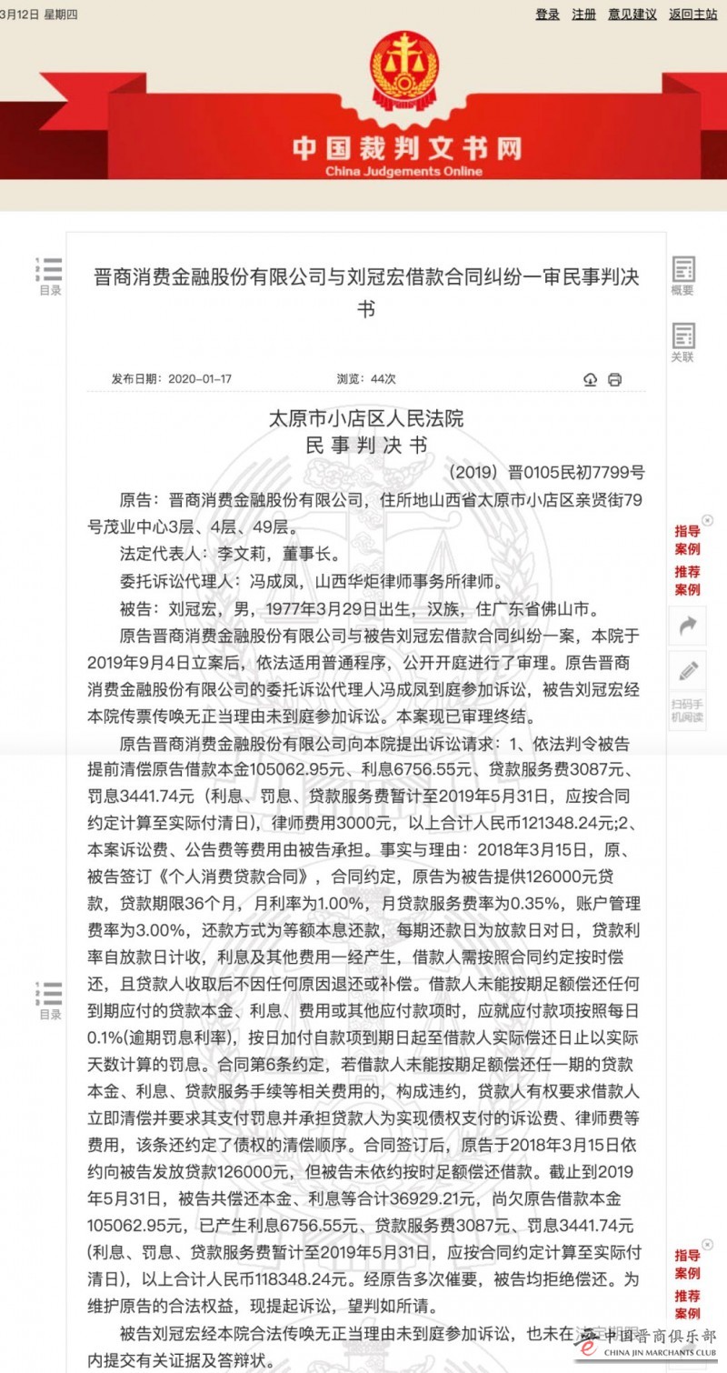 《晋商消费金融与刘冠宏借款合同纠纷一审民事判决书》显示,晋商消费金融(原告)请求法院判令刘冠宏(被告)清偿借款款本金105062.95元、利息6756.55元、贷款服务费3087元、罚息3441.74元(利息、罚息、贷款服务费),律师费用3000元,以上合计人民币121348.24元。