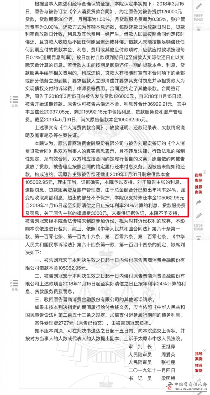 而关于贷款利率这部分,综合多起与晋商消费金融有关的个人借款纠纷民事判决书,互联网金融新闻中心注意到,法院仅支持24%以内部分。