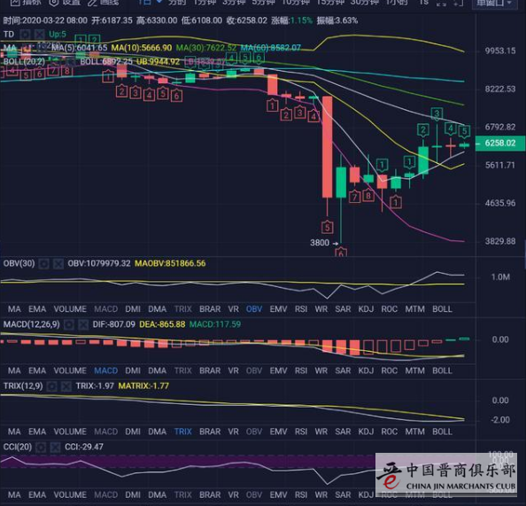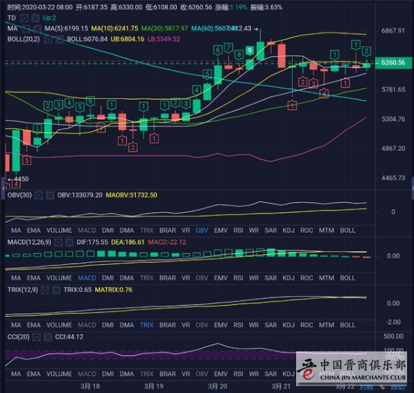 BTC日线级别如图所示,连续5个交易日持续上涨,目前5日均线向上穿过10日均线形成一个金叉,20日均线也是逐渐下移,目前上方强压力位置在20日均线附近也就是6900一线。上方短期压力位置也就是6400附近,自6900回落之后一直未能向上突破6400压力位,6400是前期的一个双底形态位置,目前也是一个顶底转换位置,所以压力是比较强的。下方在5日均线形成短支撑5900一线,这是前期的低点位置也是量能积累点。BTC日线K线昨日收取十字星,K线一直处于5日均线与10日均线走势,从日线看多头有减弱趋势,昨日收取十字星是否反转还有待观察,技术面4小时K线连续多日收取在布林带中轨与上轨走势,可见连续多日的拉升多头强势,从今日看KDJ快慢线再次粘合走拉升趋势,均线也断在走粘合走势,看短期还会延续震荡修复,短期小时线死叉再次改变进场走势。布林带没有太大的明显开口迹象,短期布林带上轨6350阻力压制,综合技术面看:日内看继续区间震荡修复为主,上方关注6500阻力。下方关注5900-6000,再次拉升反弹6400不破直接空,做多首次回落5900做多,日内操作以短线为主!