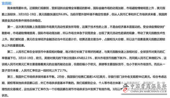 近期我们观察到,受新冠肺炎疫情全球蔓延的影响,国际金融市场的动荡加剧,市场避险情绪明显上升,美元指数上涨较快,3月10日-19日,美元指数快速拉升6.8%。当前尽管外部环境不确定性增多,但从人民币汇率和外汇市场供求来看,我国跨境资金流动有条件保持总体稳定。