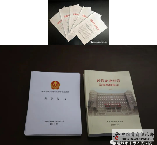“送法入企”活动中,中院向民营企业赠送了20份《关于发挥审判职能作用依法保障疫情防控和经济社会平稳发展的若干意见》12条,200本《民营企业经营法律风险提示》和200本《涉新冠肺炎疫情民商事相关法律问题提示》,两本《提示》,为民营企业家从民商事法律风险和刑事法律风险两个方面列举出170条法律问题,帮助民营企业在经营中防控法律风险,促进民营经济依法经营,高质量发展。