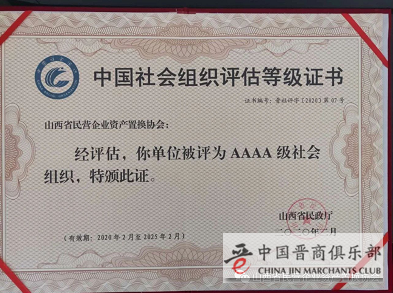 三月下旬,山西省民政厅社会组织管理局授权2019年度社会组织评估主体——山西省职业发展研究会发布山西省2019年度社会组织等级评估名单,山西省民营企业资产置换协会(中国晋商俱乐部联合发起机构)荣膺AAAA级社会组织称号,属协会同行业中最高殊荣。