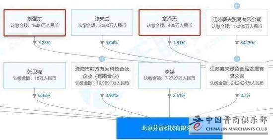 天眼查数据显示,芬香的运营主体北京芬香科技有限公司,股东名册中并没有京东。但持股芬香8.7%股权的江苏赛夫绿色食品发展有限公司,其股东名册中有刘强东和章泽天,两人分别持股7.23%和1.81%。