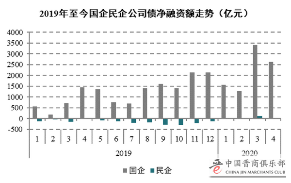 受疫情影响,国家在今年3月启动了疫情防控债,希望通过定向融资解决帮助实体经济度过难关。经统计,截至2020年4月21日,国企共发行402只合计3174亿元疫情防控债,而民企仅获发行73只388亿元。这一天壤之别也使得净融资规模本就在萎缩民企在资金链上更加捉襟见肘。