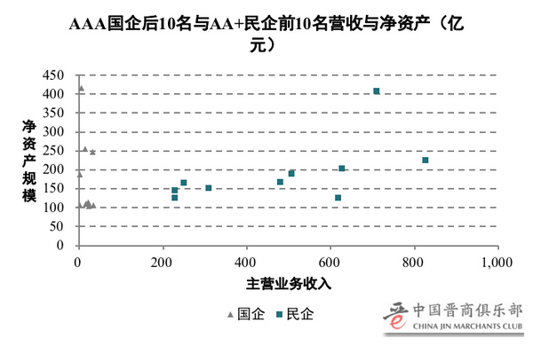就算对于同样的资质主体,国企与民企的主体评级也并不合理。通过整理净资产规模介于100-500亿元的AAA国企主营收入后10名与AA+民企主营收入前10名数据可得出,后者的主营业务收入大幅好于前者,甚至是不在一个量级上,但在评级上却反而差出一个档次,即在净资产规模相近的情况下,部分国企虽然营收比民企显著更差,却反而能承担着更低的融资成本。