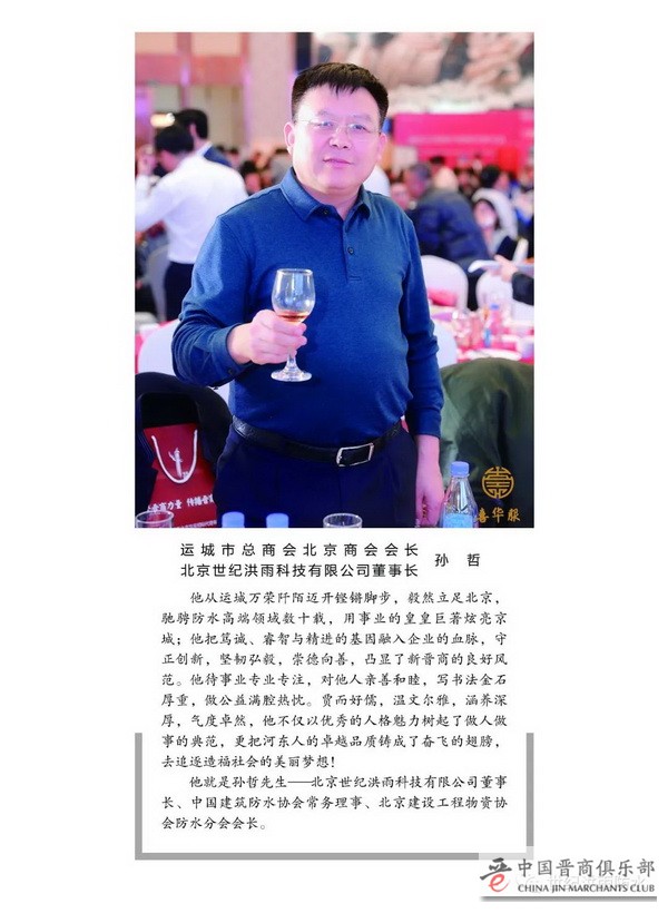 孙哲先生是一位地地道道的运城人,是一位颇有成就的卓越企业家,也是一位负责任讲道义的优秀公民。他和他的企业以专业、专注、专心的精神和品质,不仅成就了世纪洪雨的辉煌事业,更无私地贡献于崇高的防水事业,并且情系公益,情系家乡,造福社会,展现出他那浓浓的家国情怀。功崇惟志,业广惟勤,孙哲先生奋发有为,内外兼修,崇德向善,无疑为我们树起了做人做事的标杆。愿有更多的企业家能如孙哲先生一样,志存高远,勤勉奋斗,不负韶华,大有作为。