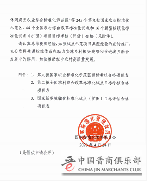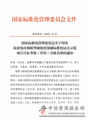 2020年4月24日,国家标准化管理委员会印发【2020】21号文件《农业农村和新型城镇化领域标准化试点示范项目目标考核 (评估)合格名单的通知》,公布《第九批国家农业标准化示范区目标考核合格名单,项目编号SFQ9-206号《戎子酒庄国家酿酒葡萄栽培标准化示范区》成功列入。