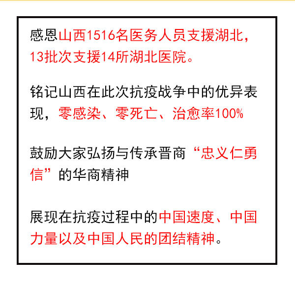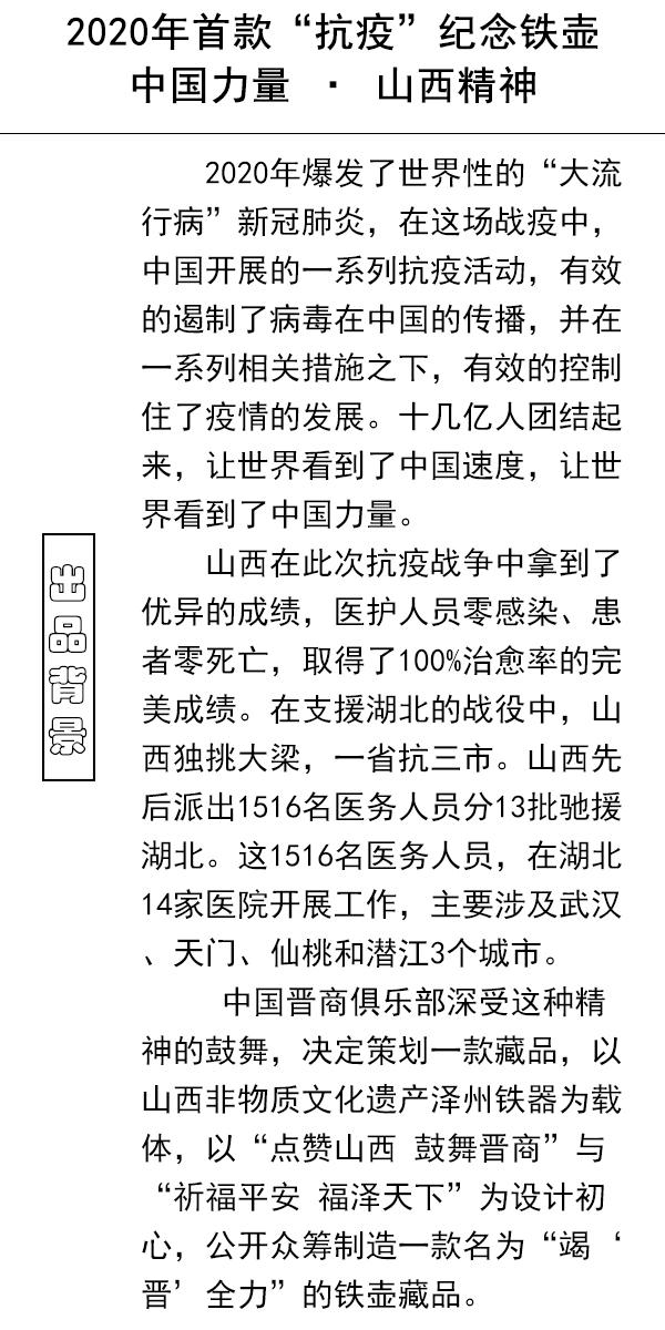 为了纪念2020年爆发的新冠疫情中祖国表现出的中国力量、山西医护表现出的“忠义仁勇信”精神,由中国晋商俱乐部出品,将由非遗泽州铁器传承人“晋韵堂”打造,截止2020年5月15日,在93位晋商及商友的积极众筹预定下,300把限量版【竭晋全力·铁壶】众筹预定活动完美收官。