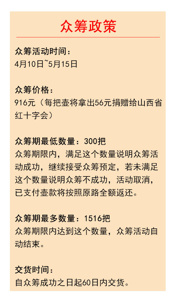 2020年5月15日,【竭晋全力·铁壶】众筹预定活动圆满截止,即日起,不再接受众筹预定期内916元价格订购。