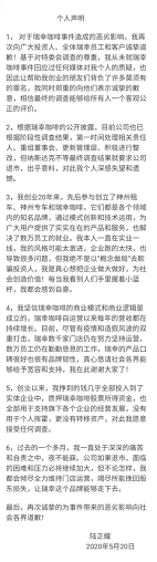 1、 对于瑞幸咖啡事件造成的恶劣影响,我再次向广大投资人、全体瑞幸员工和客户诚挚道歉!基于对特委会调查的尊重,我从未就瑞幸咖啡事件回应过任何媒体对我个人的质疑,也因此让帮助我创业的朋友们背负了许多莫须有的罪名,我同时郑重的向他们表示诚挚的歉意,相信最终的调查能够给所有人一个客观公正的评价。