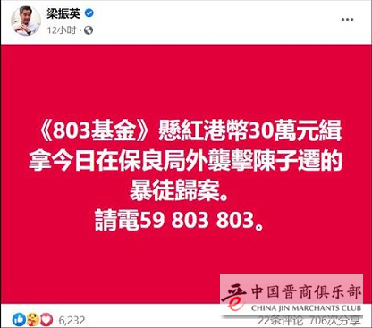 另据观察者网查询,受伤律师名叫陈子迁,他仅仅是路过事发地,见数十名黑衣暴徒堵路,遂与对方理论,竟惨遭“私刑”。全国政协副主席、香港特区前行政长官梁振英昨晚在Facebook发文,悬赏30万港币,缉拿袭击陈子迁律师的暴徒。