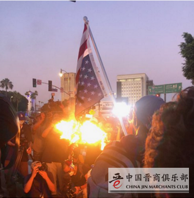 报道称,有示威者敲打试图穿过人群的警察巡逻车的引擎盖,有人似乎用滑板砸坏了警车的后玻璃。据《洛杉矶时报》的说法,至少有一名示威者在警车驶离时,从车上摔下来并被送医。报道还称,甚至有示威者当街焚烧美国国旗。社交媒体推特上也流传了多段示威者焚烧美国国旗的视频。