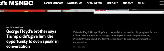 黑人男子弗洛伊德被警察“膝盖锁喉”致死引发骚乱的第五天,死者弗洛伊德的兄长出面戳穿了总统特朗普一个“谎言”。后者29日称,他已与弗洛伊德的家人通了电话。但弗洛伊德的兄长菲洛尼斯30日对媒体,特朗普的确打来了电话,“他连说话的机会都没给我”。
