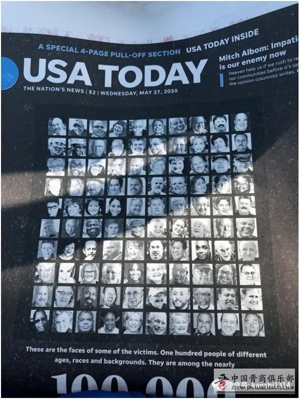 然而,美国人首先受不了了,开始站出来为死去的人发声,继《纽约时报》5月24日头版“千人讣告”后,5月27日《今日美国报》(USA TODAY)头版刊发因新冠肺炎去世的“百人照片”。这实属罕见。
