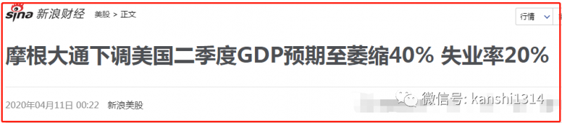 那大家再想想,美国经济陷入停滞的四月和五月份,会给二季度带来何种影响呢?如果按照高盛的预测,美国第二季度GDP将下跌34%,其他官方和民间机构的预测都高于高盛的预测,有的机构直接预测二季度美国GDP将萎缩40%。