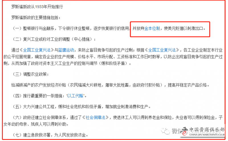 请注意,这里面关于整顿银行与金融系等等,都是很常规的做法,重点是最后一句:“放弃金本位,使美元贬值以刺激出口”。