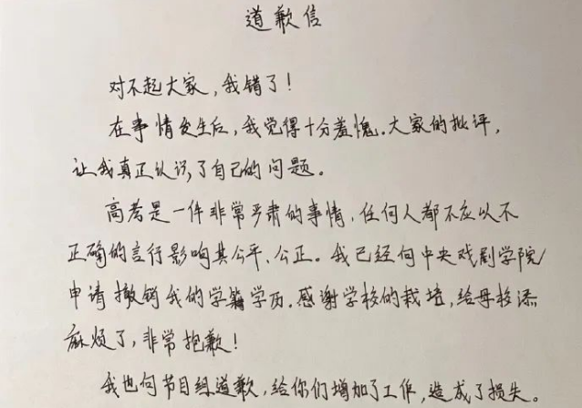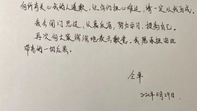 5月29日,“沉默”一段时间后的仝卓通过社交平台发布道歉信称:十分羞愧,申请撤销学籍,愿意承担一切后果。并附上一封署名为“仝卓”的手写《道歉信》。信中,仝卓自称已经向中央戏剧学院“申请撤销学籍学历”。